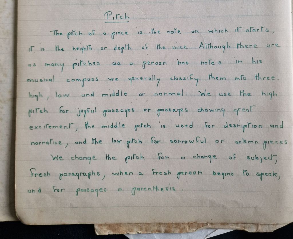 The pitch is a piece is the note on which it starts, it is the height or depth of the voice. Although there are as many pitches as a person has notes in their musical compass we generally classify them into three. High, low and middle or normal. We use the high pitch for joyful passages or passages showing great excitement, the middle pitch is used for description and narrative and the low pitch for sorrowful or solemn pieces.