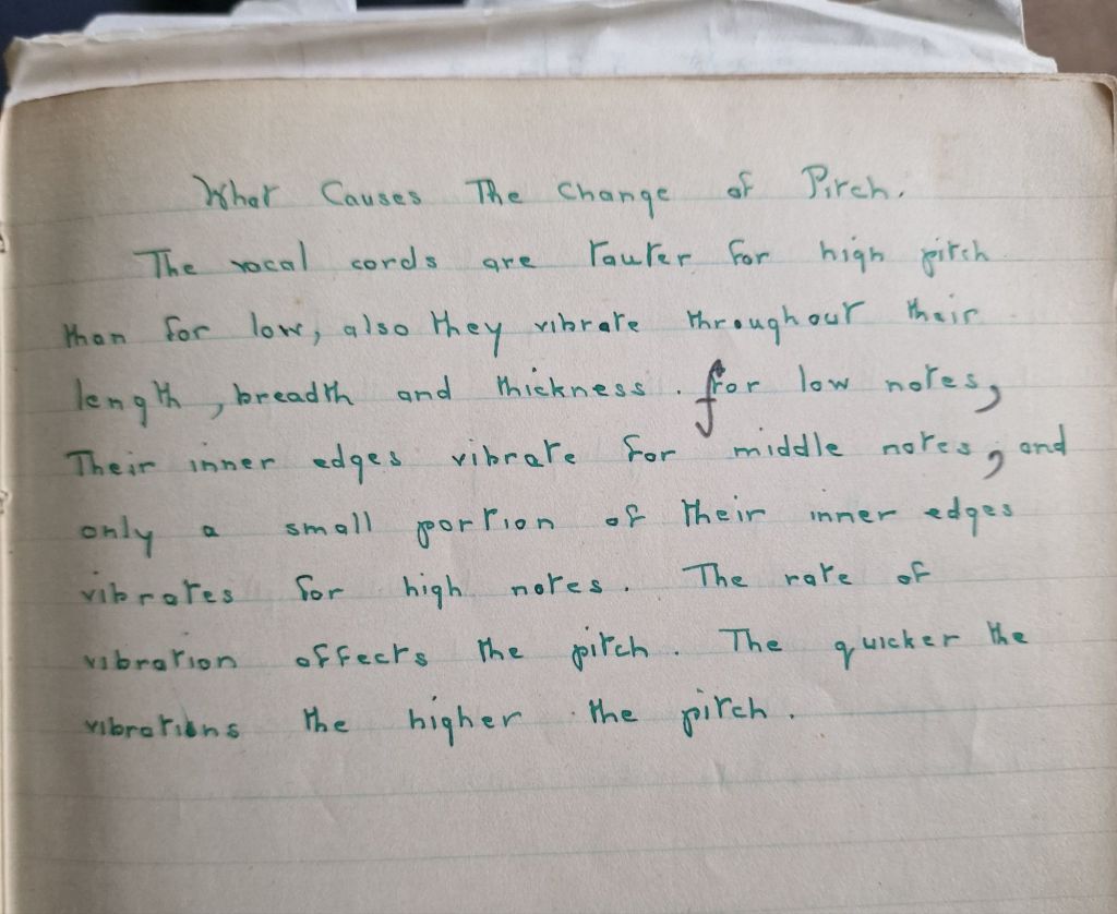 The vocal cords are tauter for high pitch than for low, also they vibrate throughout their length, breadth and thickness for the low notes. Their inner edges vibrate for the middle notes and only a small portion of their inner edges vibrate for the high notes. The rate of vibration affects the pitch. The quicker the vibrations the higher the pitch.