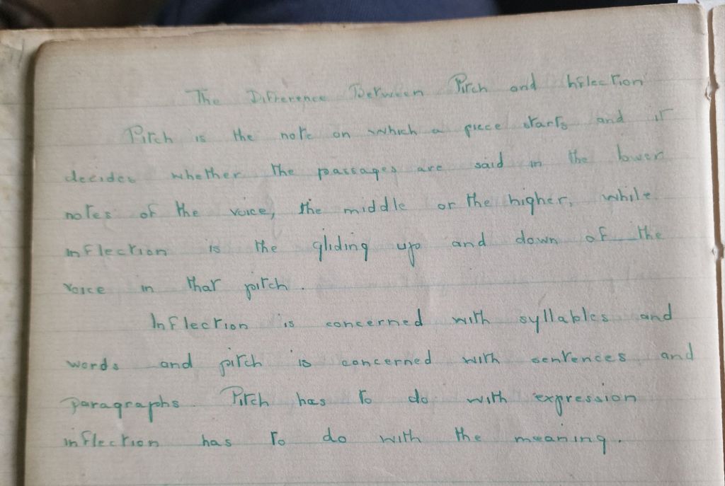 Pitch is the note on which a piece starts and it decides whether the passages are said in the lower notes of the voice, the middle or the higher, while inflection is the gliding up and down of the voice in that pitch.